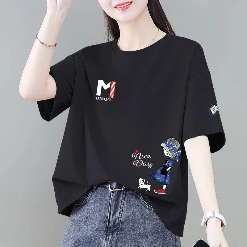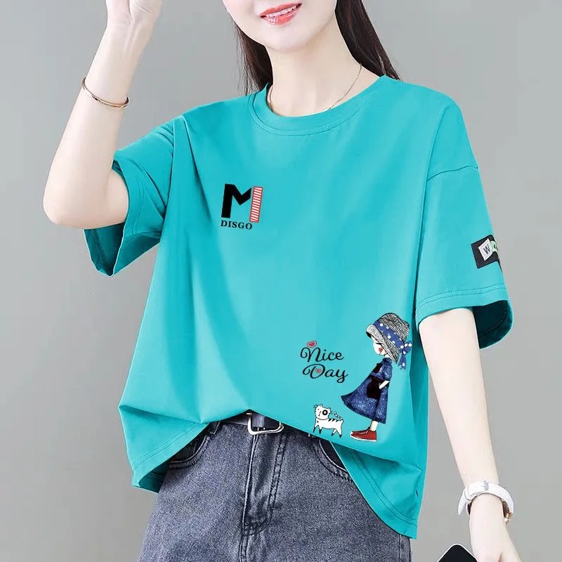 00% Pure Cotton ort Sve T-irt Women's Summer Faion Loose Sli Age-Defng Versatile Top Korean Sle Print Design