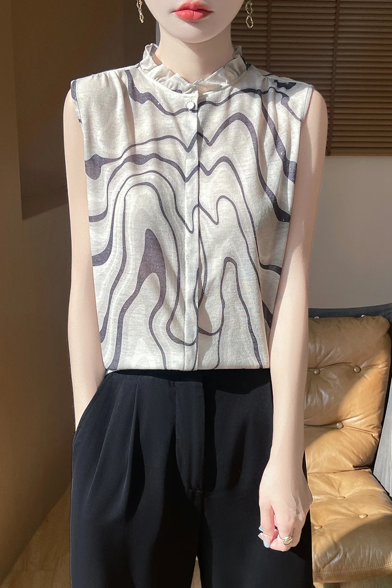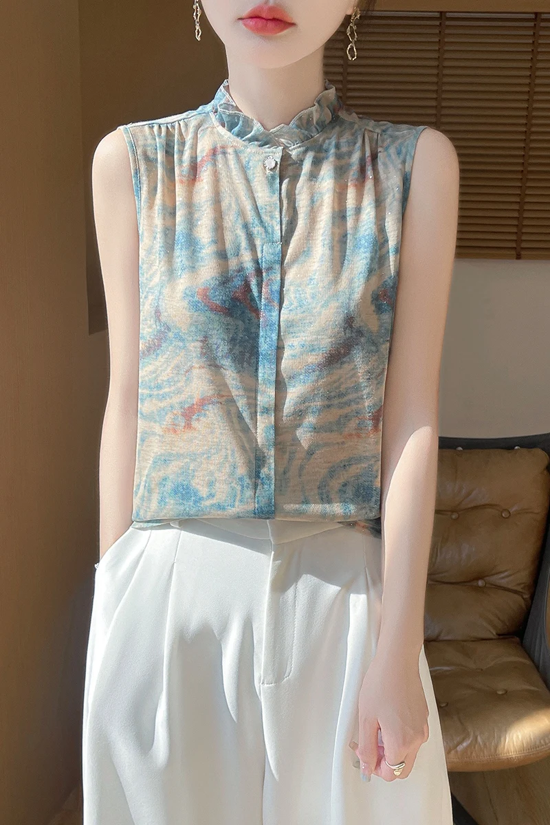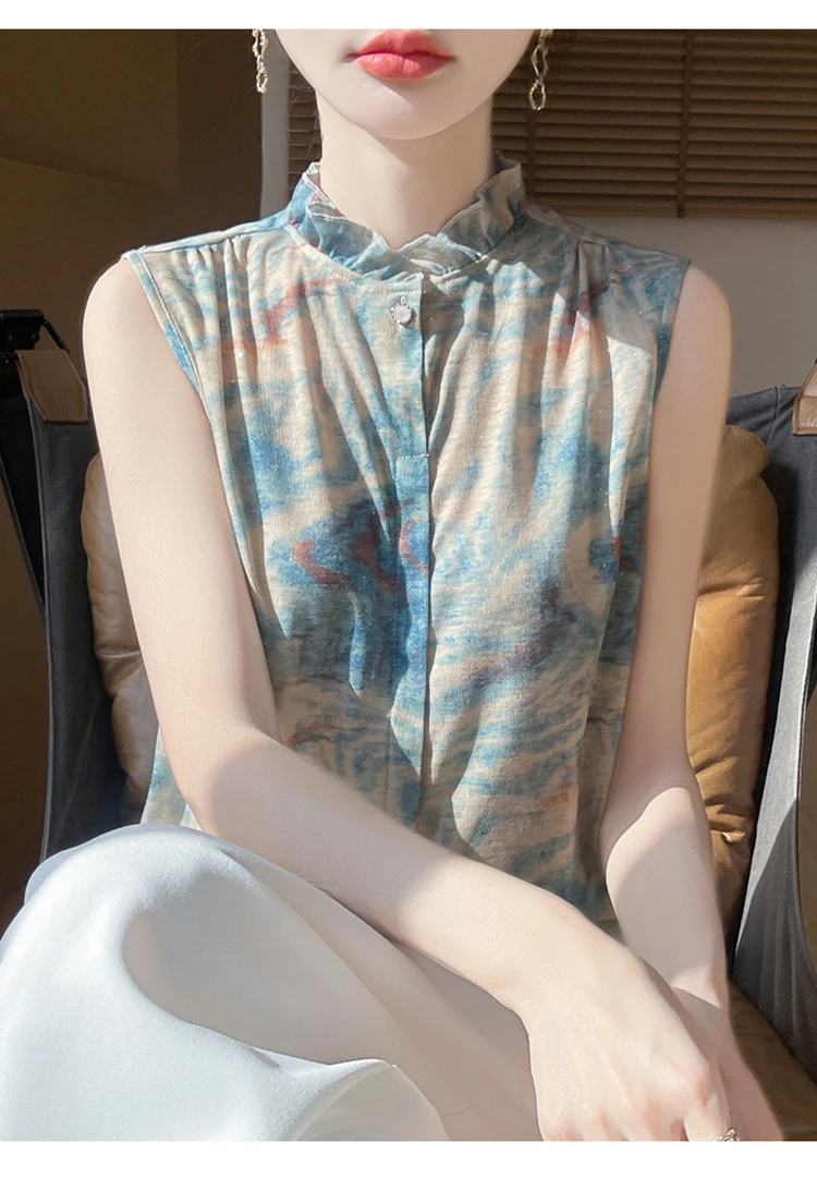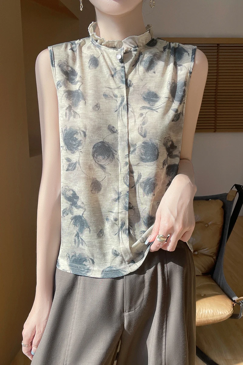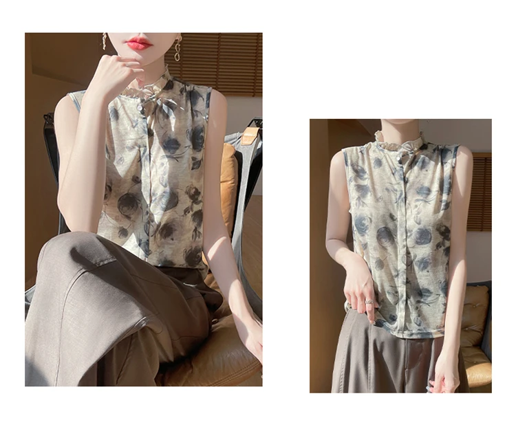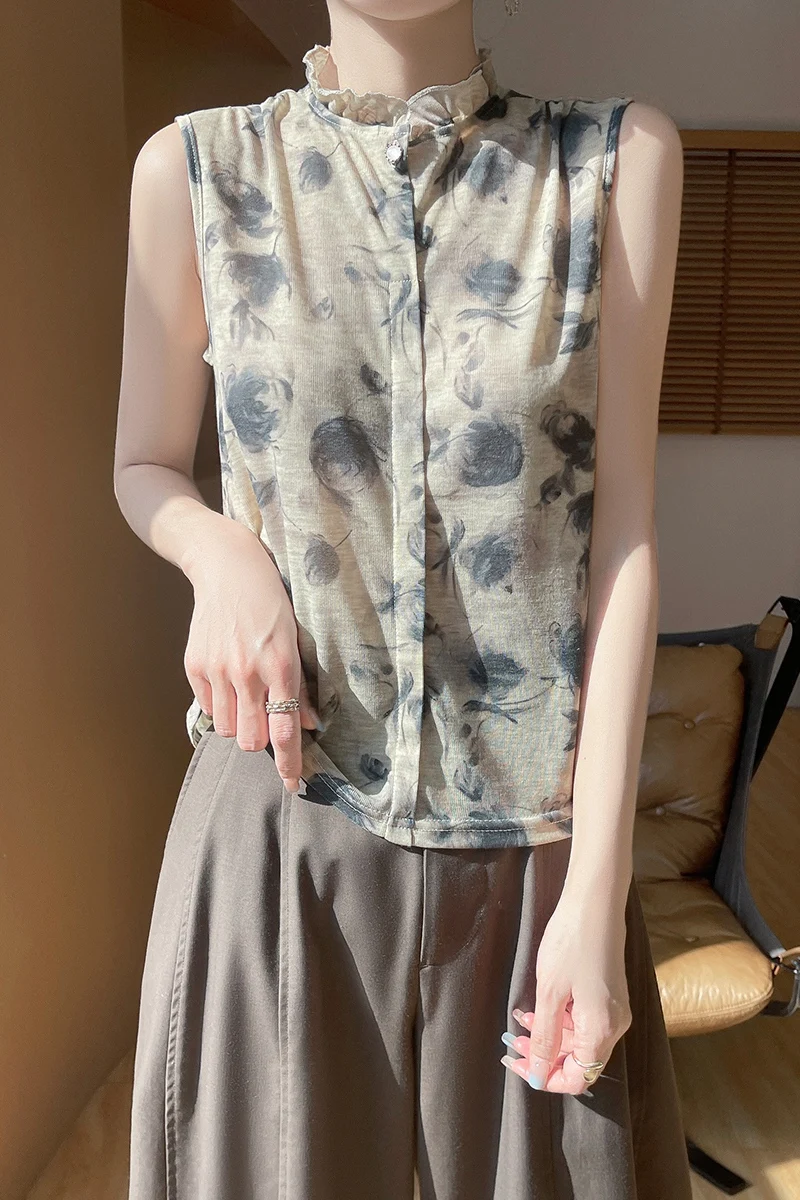 2025 New Chinese Sleeveless Shirt Lace Collar Knit Base Shirt Ink Painting National Style Fashion Western Style Blouse RW M13