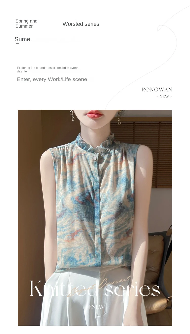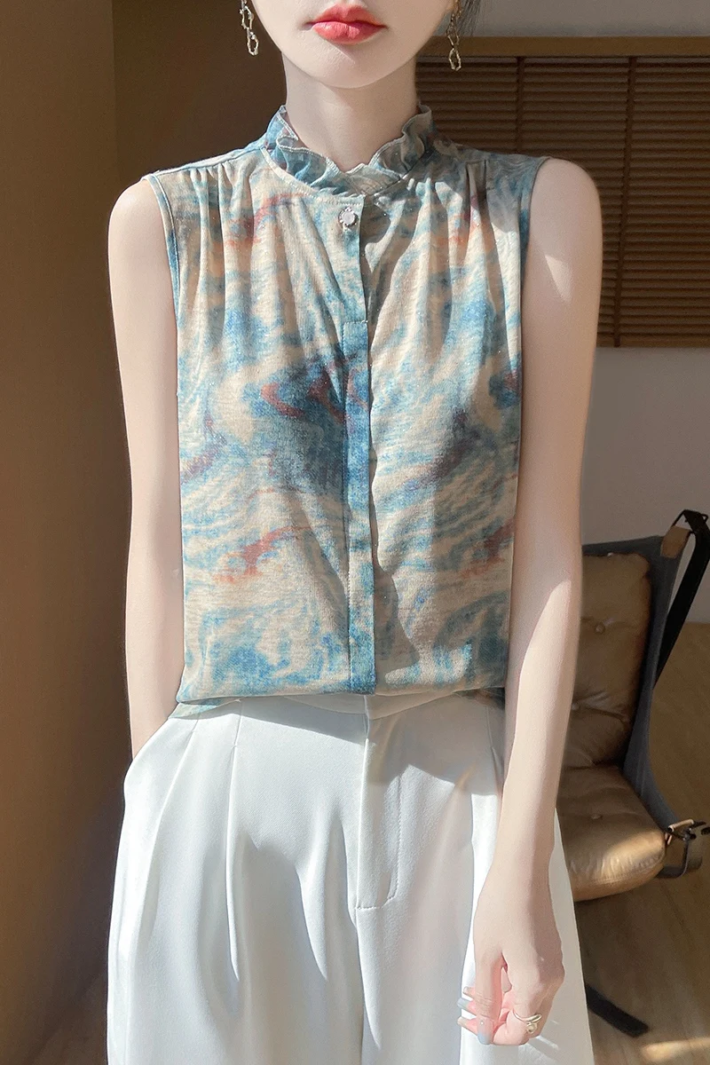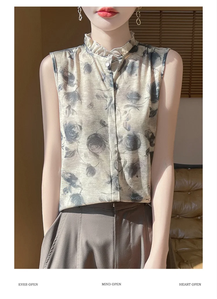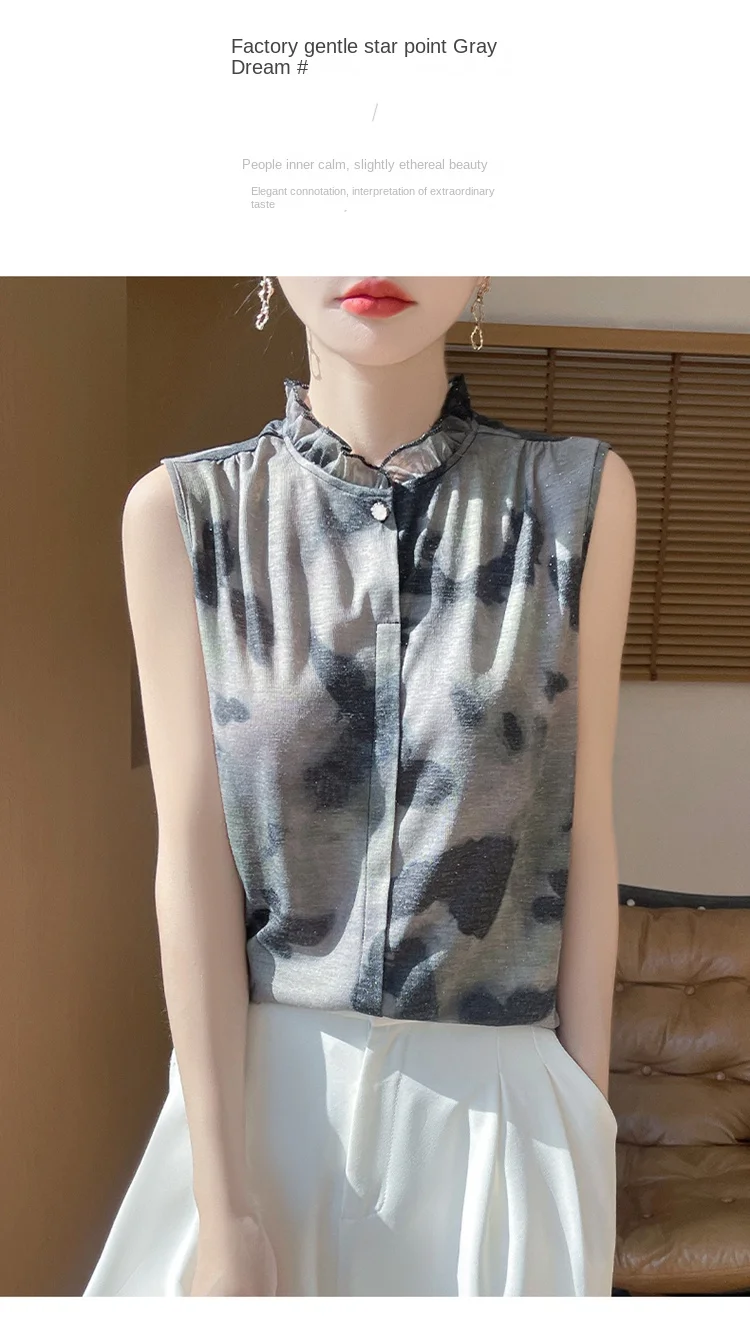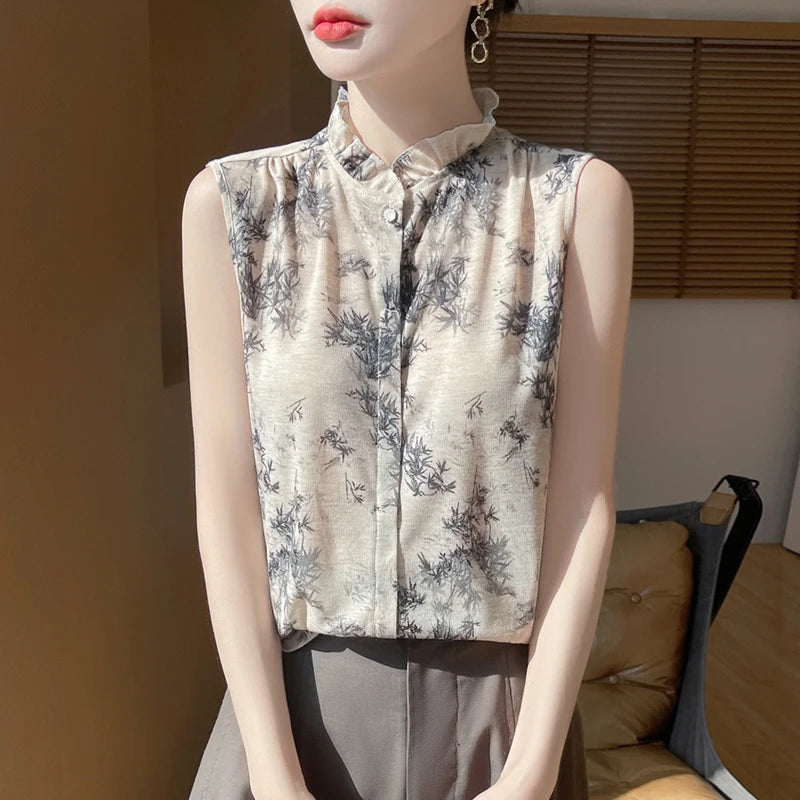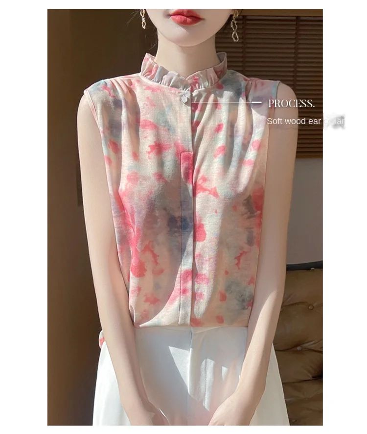 2025 New Chinese Sleeveless Shirt Lace Collar Knit Base Shirt Ink Painting National Style Fashion Western Style Blouse RW M13