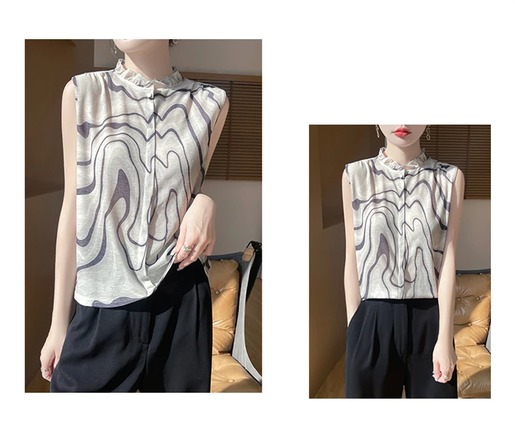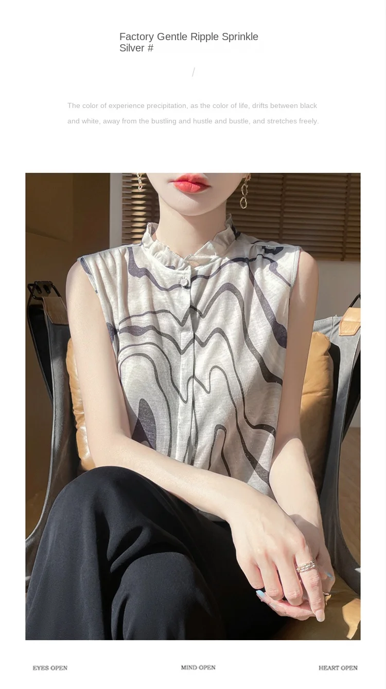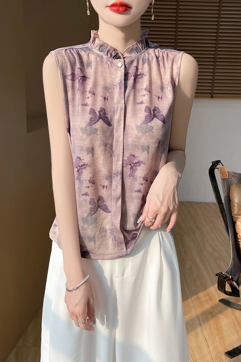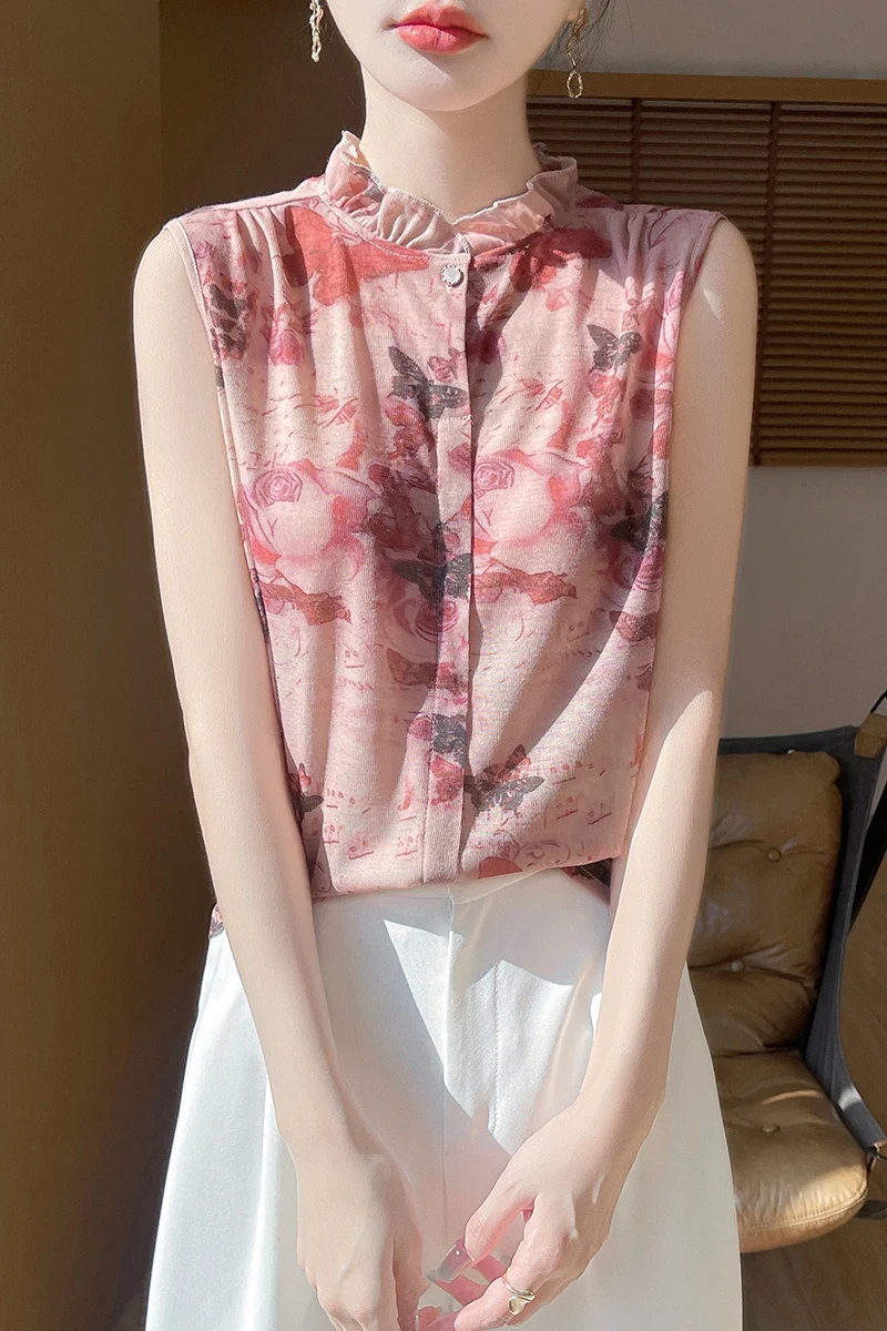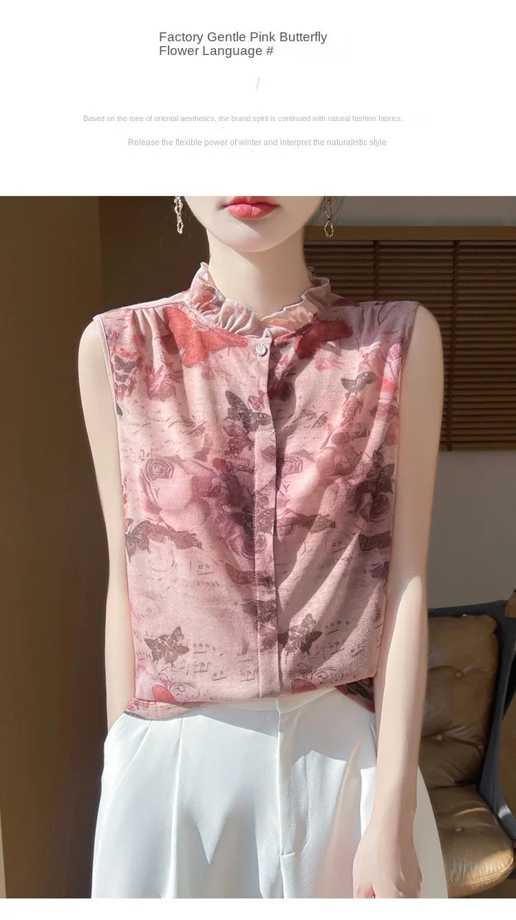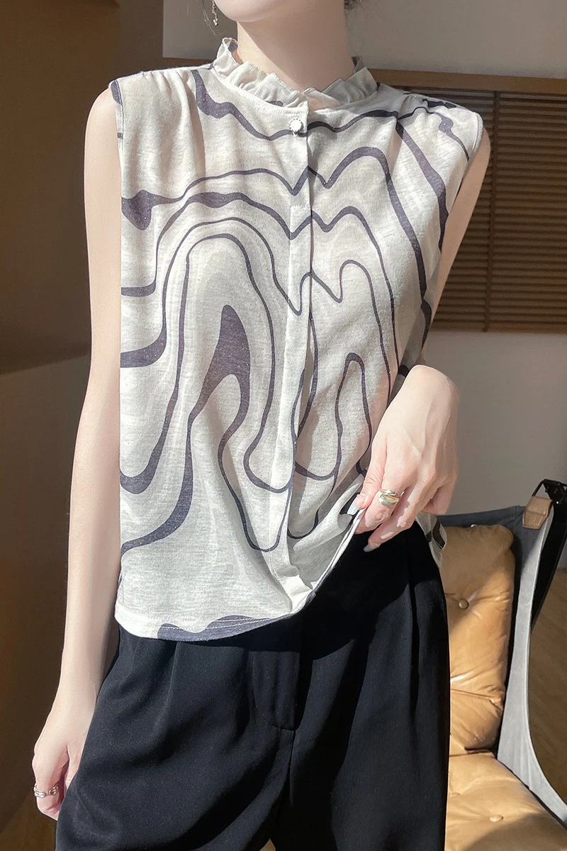2025 New Chinese Sleeveless Shirt Lace Collar Knit Base Shirt Ink Painting National Style Fashion Western Style Blouse RW M13