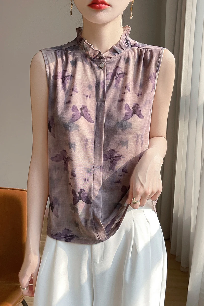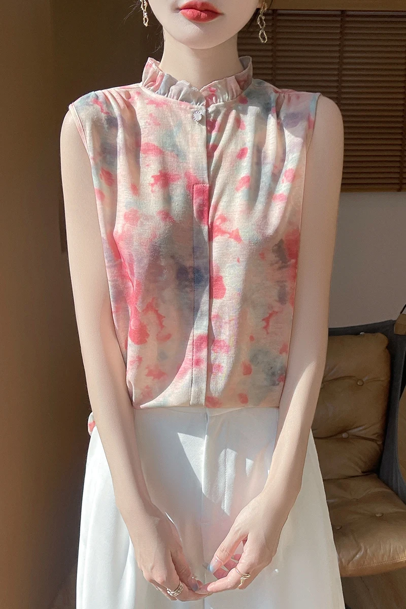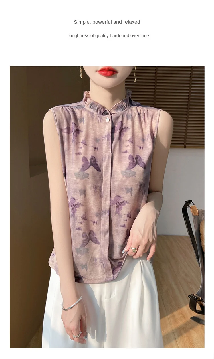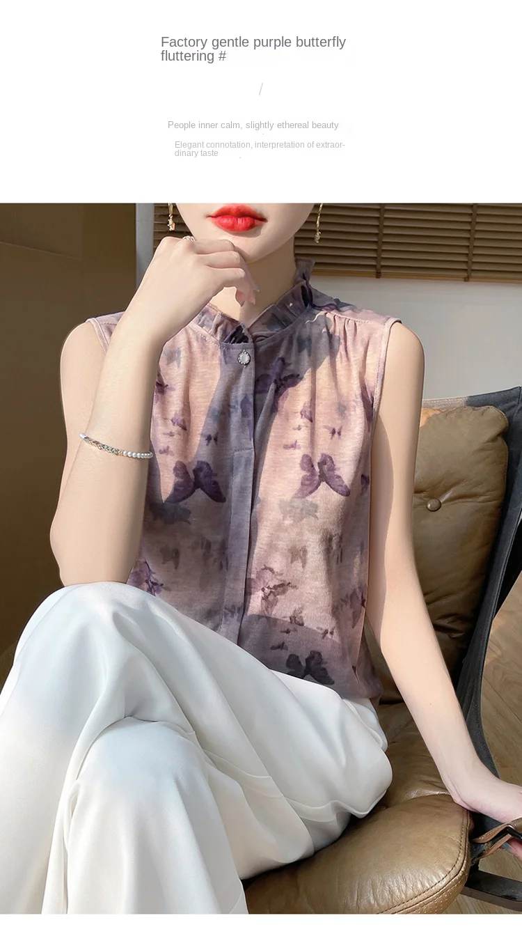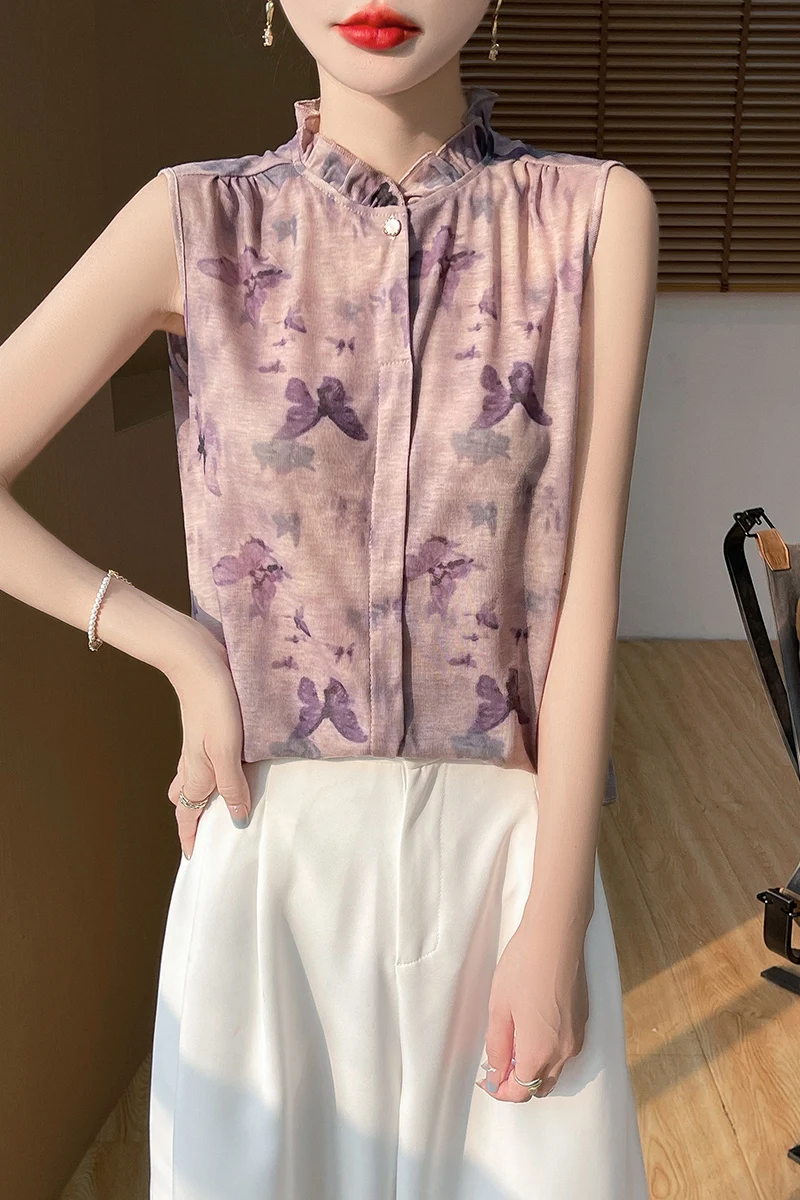 2025 New Chinese Sleeveless Shirt Lace Collar Knit Base Shirt Ink Painting National Style Fashion Western Style Blouse RW M13