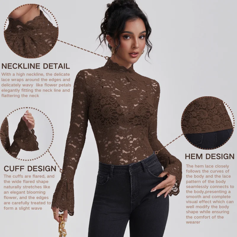 Anfilia Women Lace Shirts Turtle Neck Elegant Flare Long Sleeves Hollow Out Slim-fit Crochet Sexy Blouse