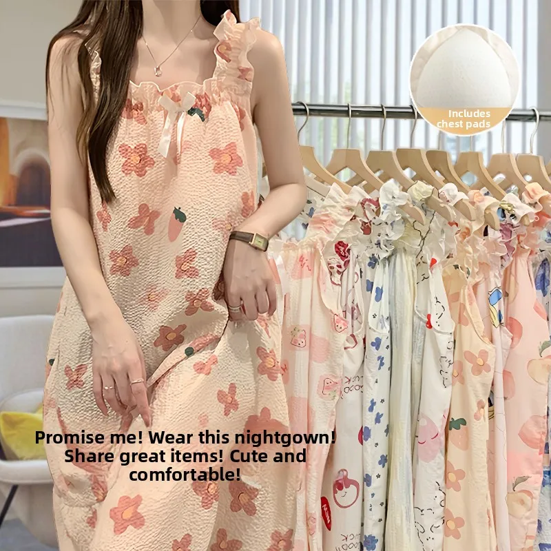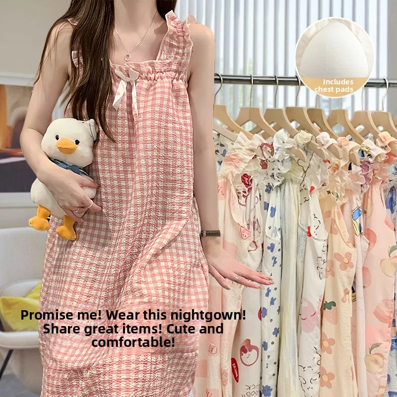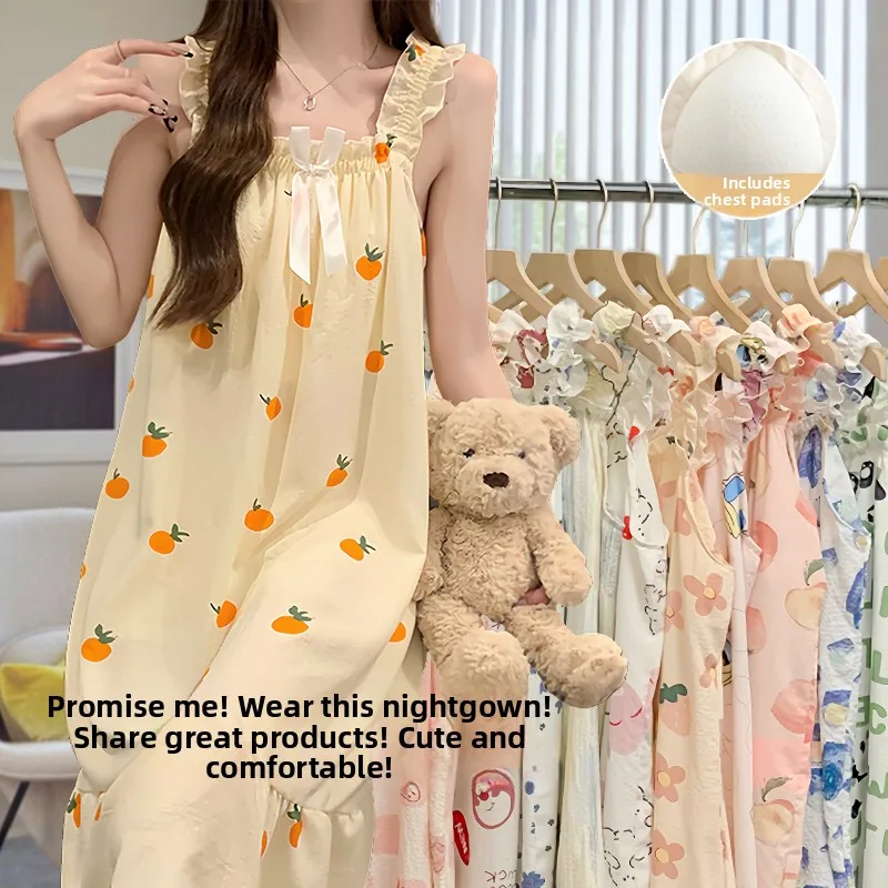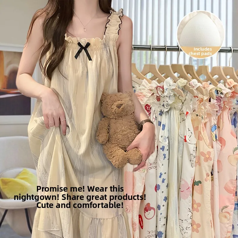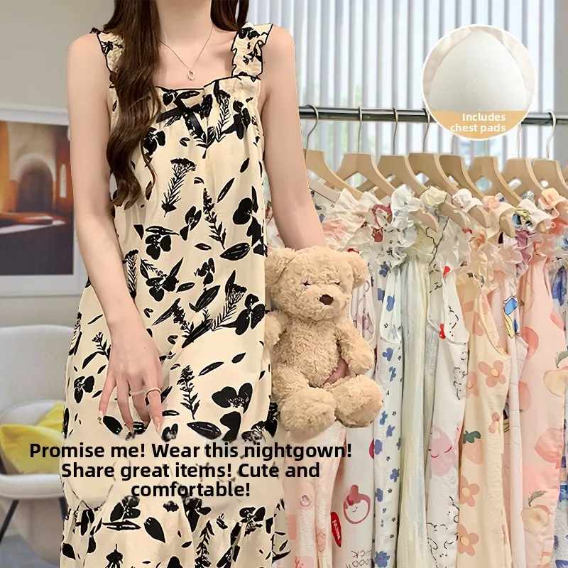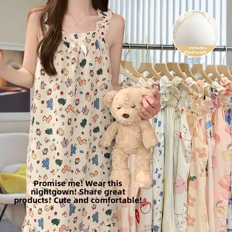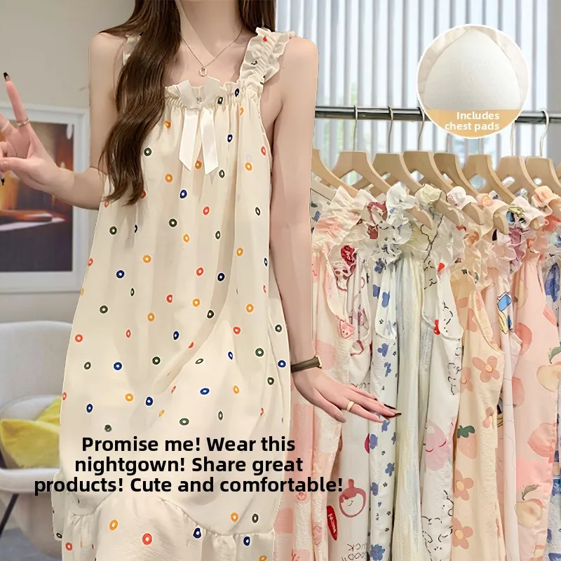 Cloud Cotton Sp Dr Women's Summer Strap Built-in Chest Pad Medium Length Thin Cute 2025 New Nightgown Home Clothes