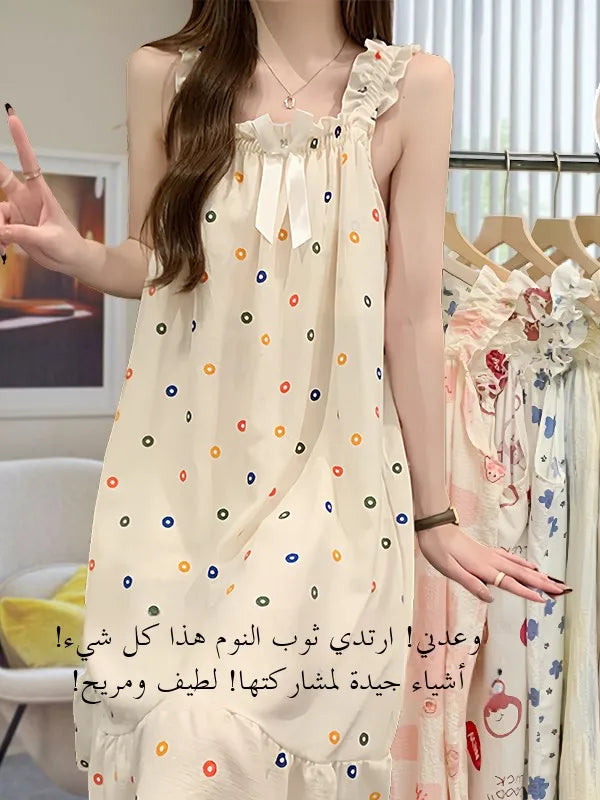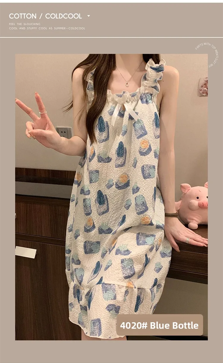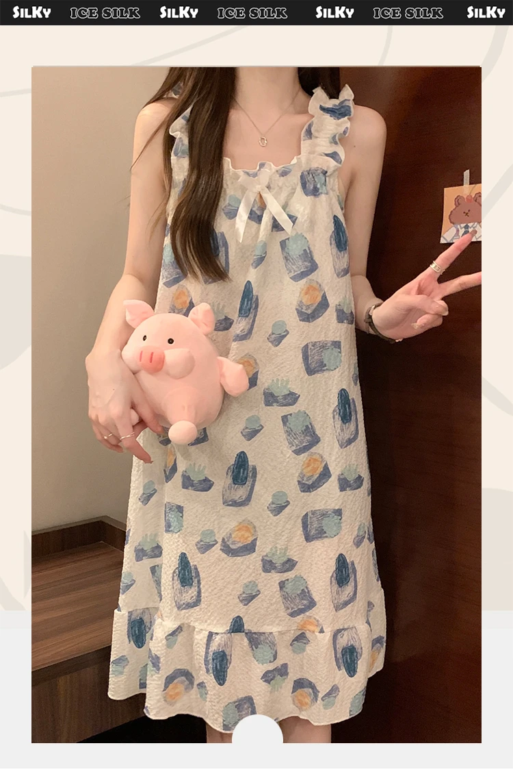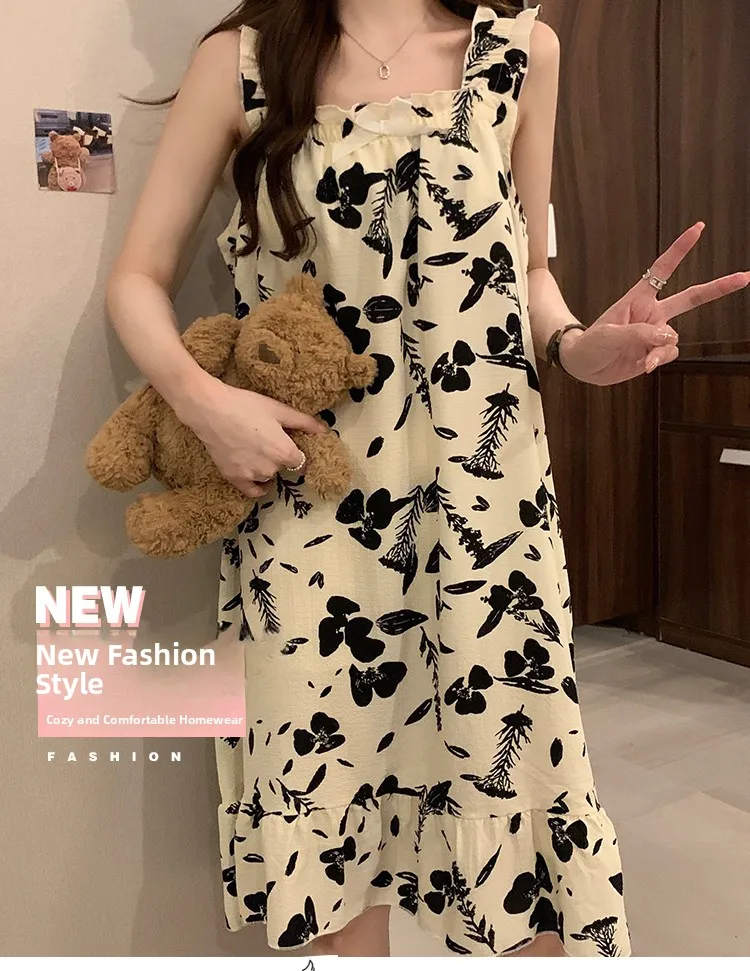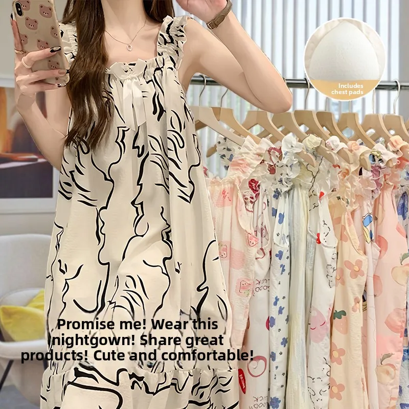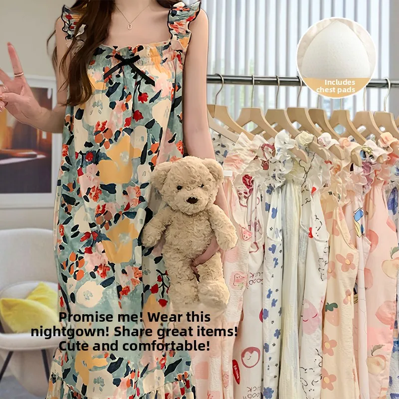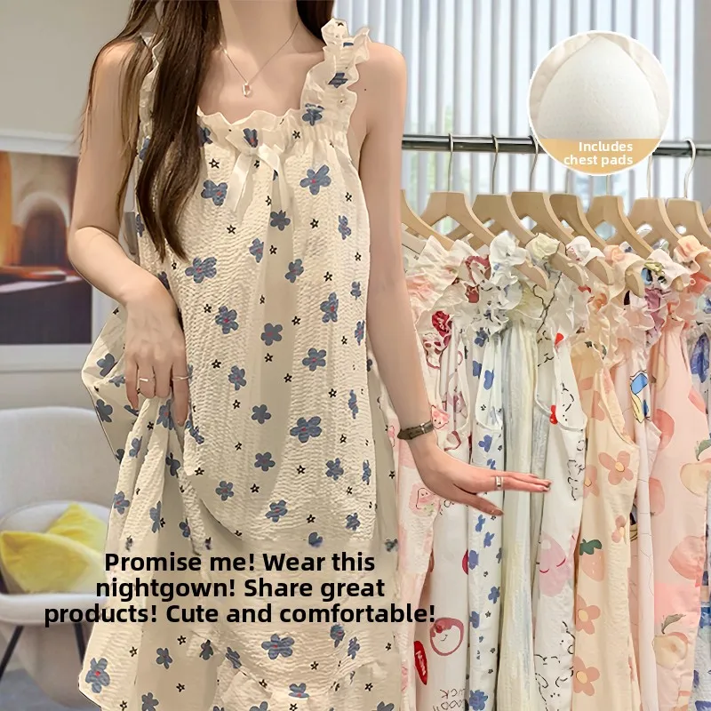 Cloud Cotton Sp Dr Women's Summer Strap Built-in Chest Pad Medium Length Thin Cute 2025 New Nightgown Home Clothes