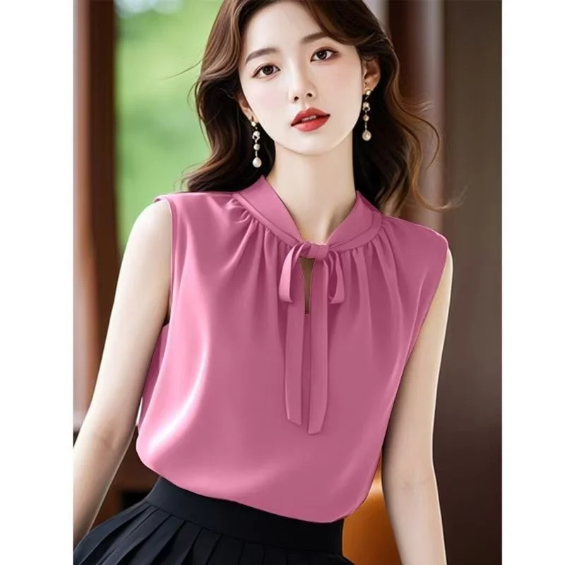 French Women Fashion Chiffon Blousees Vest Summer Ladies Bow Blouse Waistcoat High-grade Female Solid Color Sleeveless Shirts
