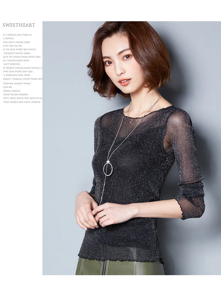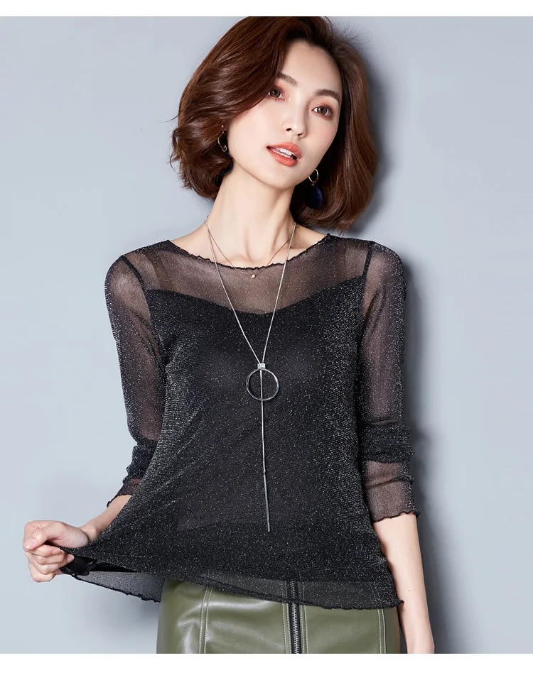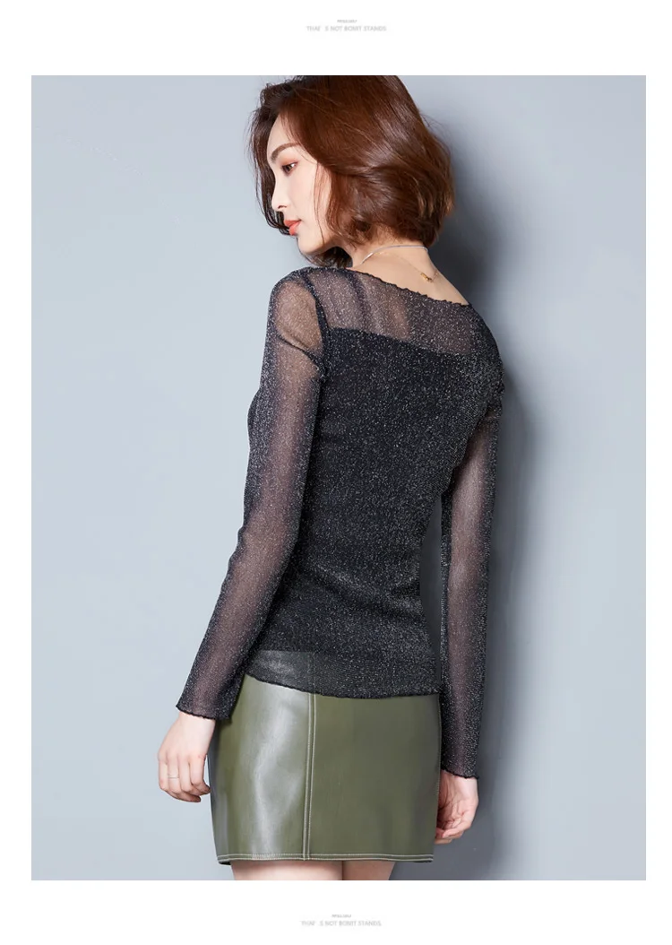 Glitter Mesh Blouse Sexy Womens Shirts Long Sleeve Tops Korean Black Pink O-Neck Elegant Slim Blouse Camisas Femininas