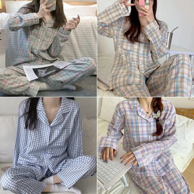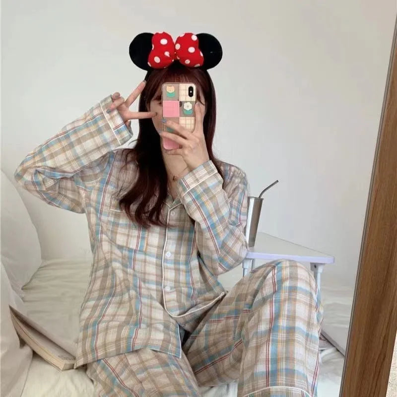 Pajamas Female Autumn and Winter Long-Sleeved Sweet Nightwear Homewear Two-Piece Set Women Plaid Casual Simple Sleepwear