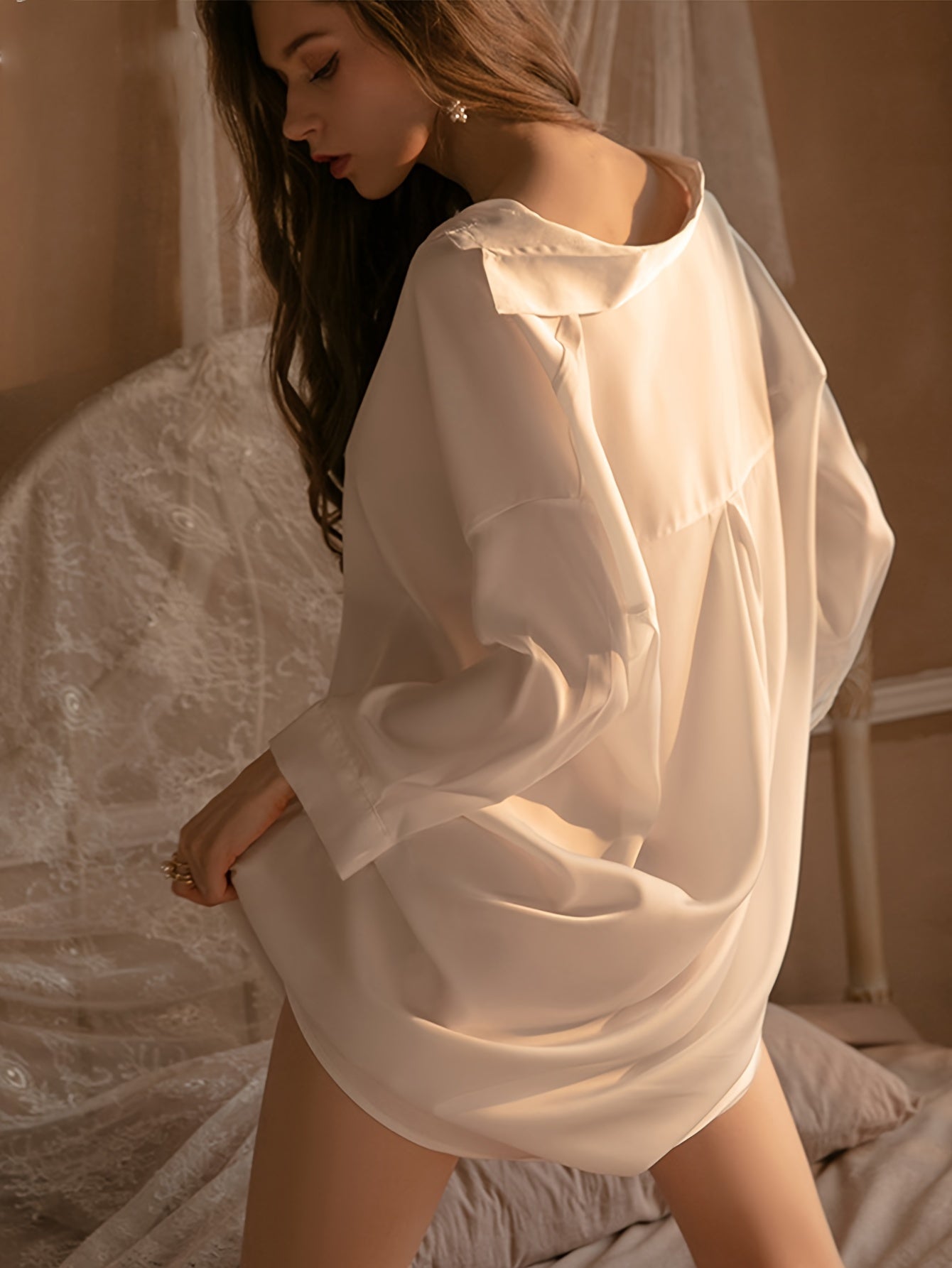 Sexy Solid Shirt Night Robe, Long Sleeve Button Up Lapel Collar Sleep Robe, Women's Sleepwear & Dresses