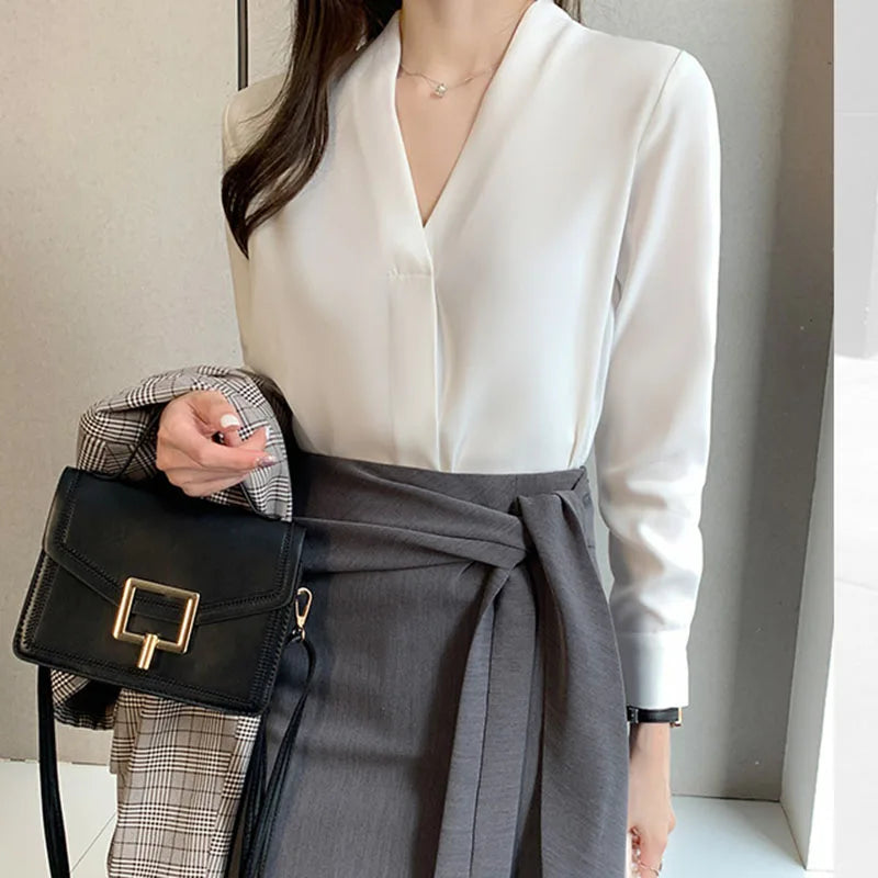 Spring Autumn Long Sleeve White Shirt Women Korean Temperament V-neck Office Lady Chiffon Blouse Elegant Street Loose Blusas