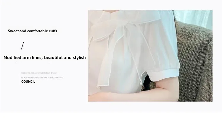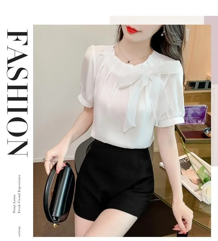 Summer New Elegant Korean Style Round Neck Ruffles Bow Short Sleeve Chiffon Blouse For Women Beautiful Sweet Little Blouse