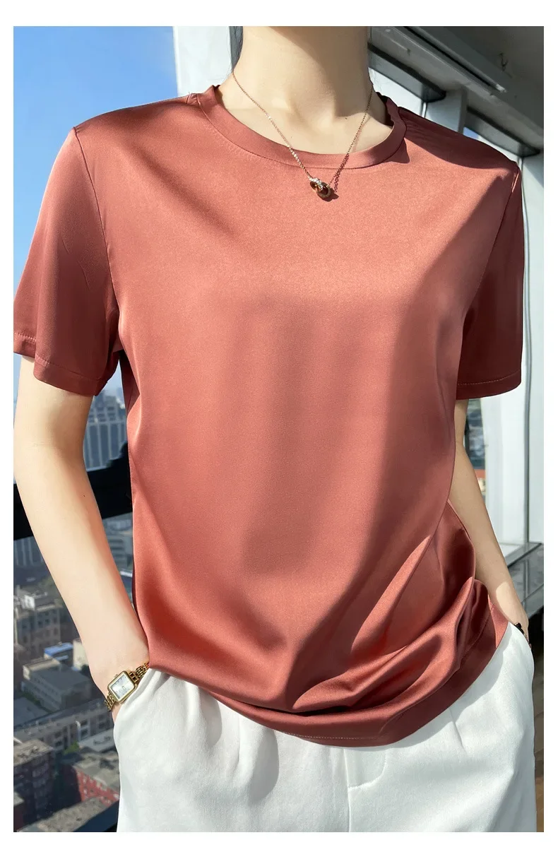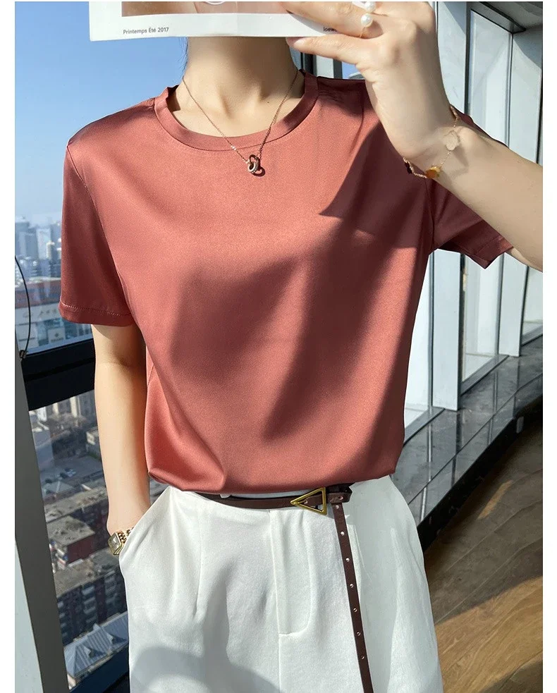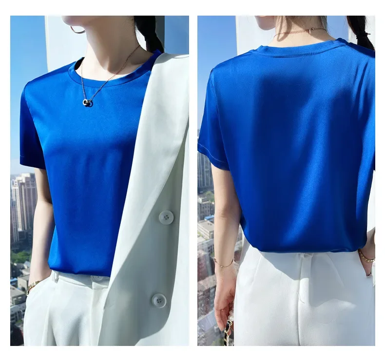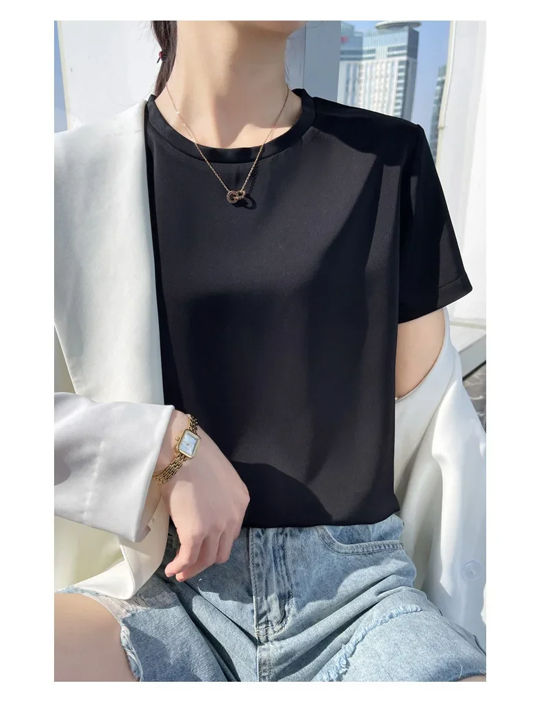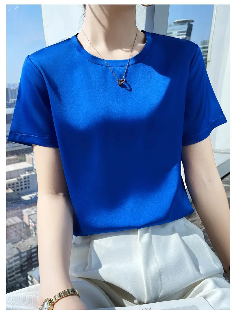 Summer T-shirts Woman O Neck Short Sleeves Tees Satin Klein Blue Champagne Solid Color Loose Women's oversized T Shirt Silk Tops