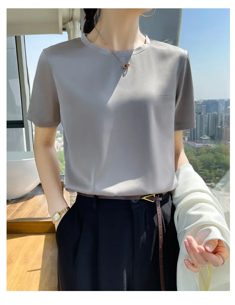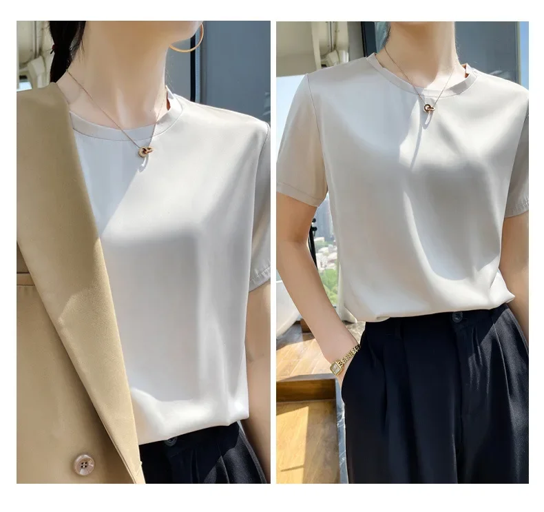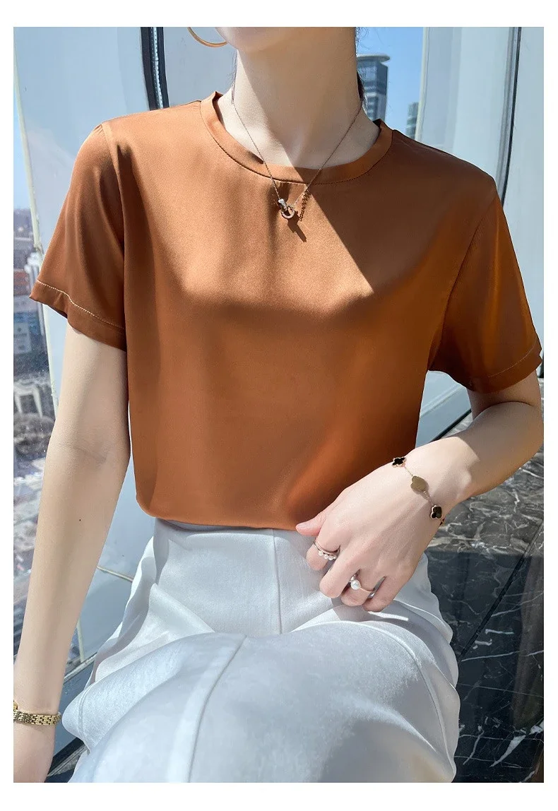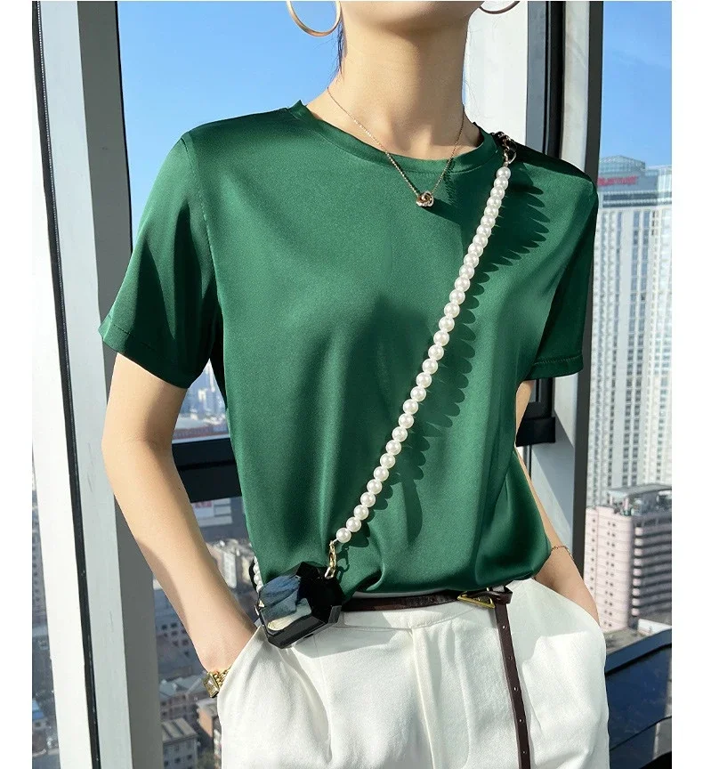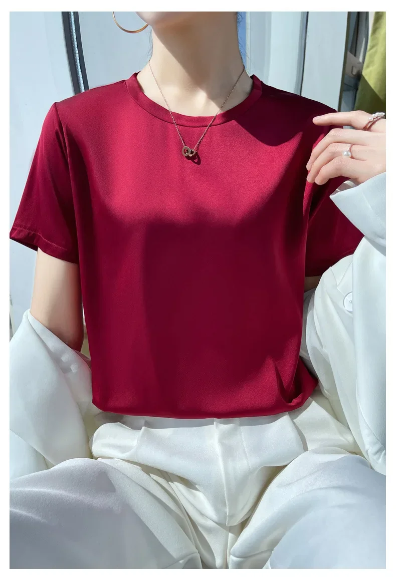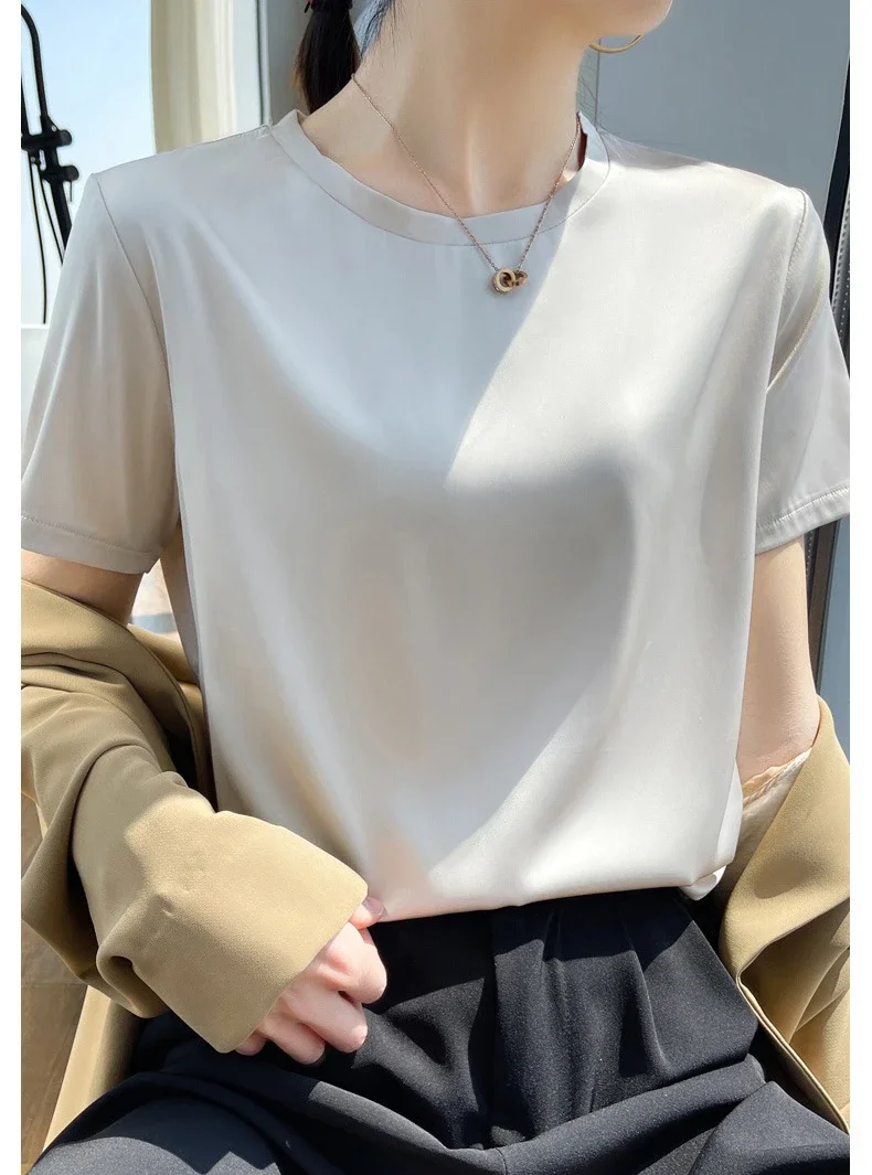 Summer T-shirts Woman O Neck Short Sleeves Tees Satin Klein Blue Champagne Solid Color Loose Women's oversized T Shirt Silk Tops