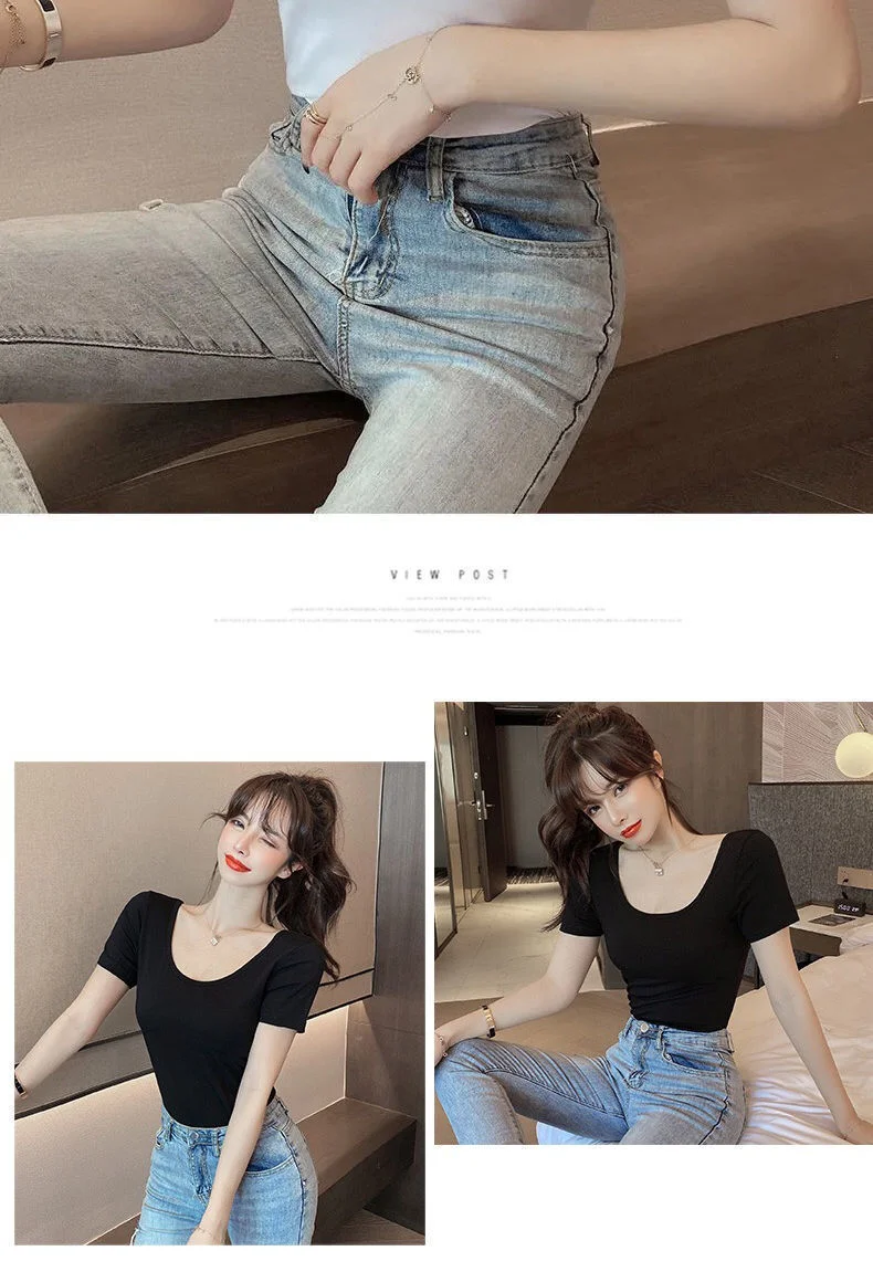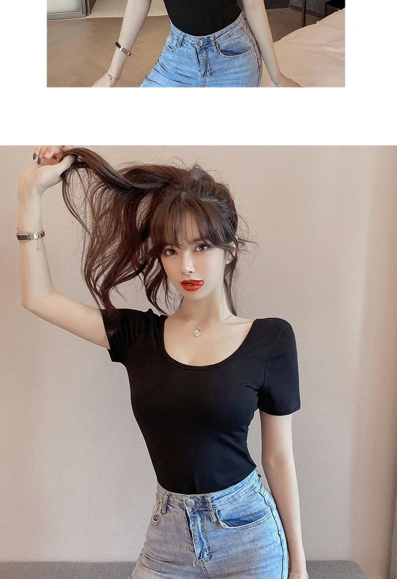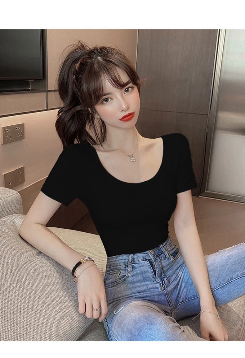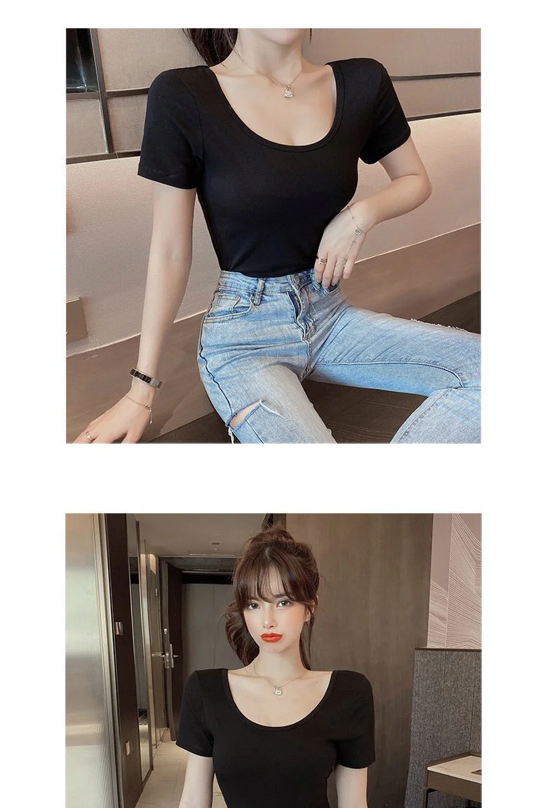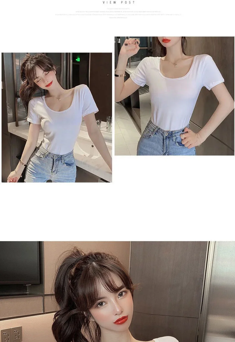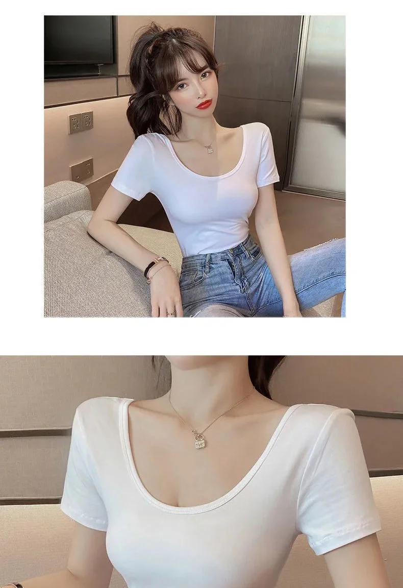 White T-shirt Women Short Sleeve U-neck Summer Low-cut Sexy Slim Top Shaping Base Shirt Comfortable Style Polyester Fabric