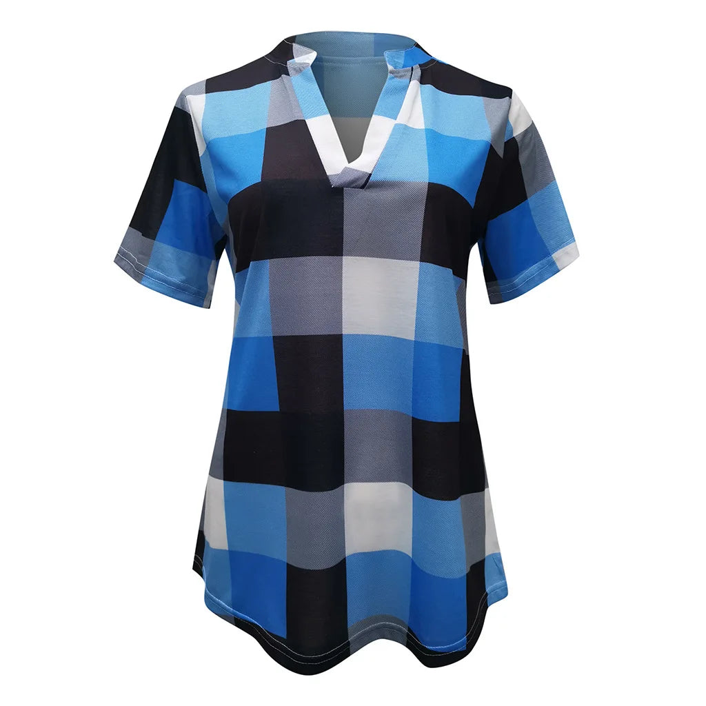 Women Vintage Short Sleeve Shirt V Neck Plaid Shirts Summer Female Casual Blouse Tops Streetwear Korean Style Clearance Sale