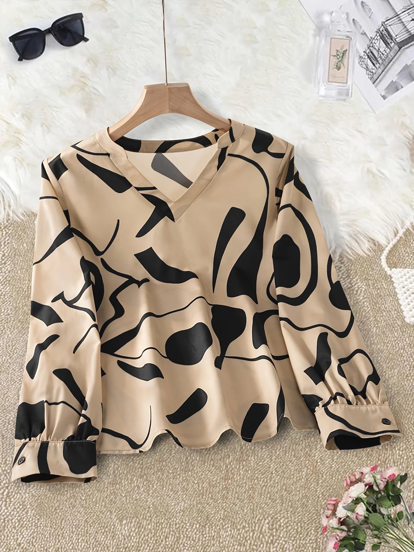 The all-over print adds a unique visual interest, making this blouse a standout piece in any wardrobe.