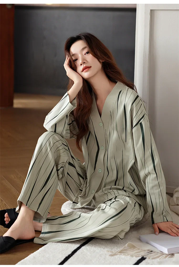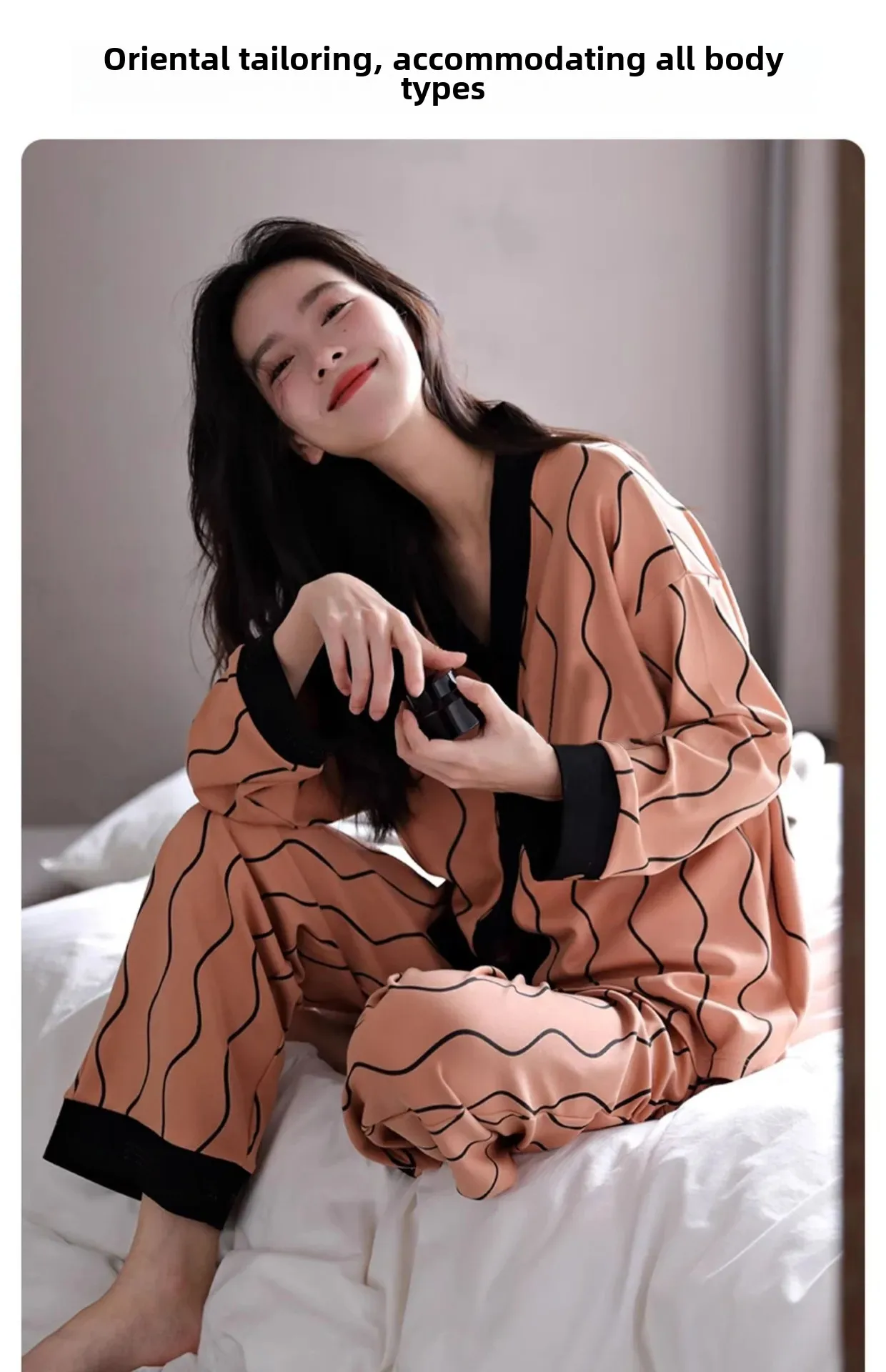 Women's Spring Autumn Long Sleeve Cotton-Like Kimono Loose-Fit V-Neck Sleepwear Sweet Home Clothes Korean Style Outer Wear
